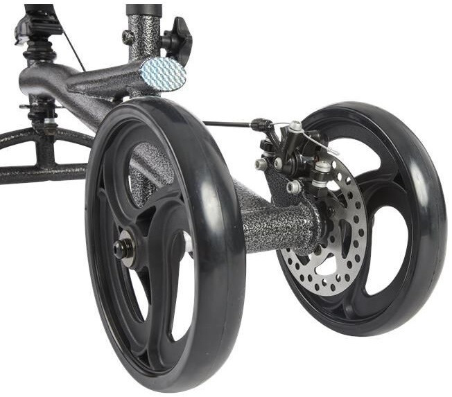Equipped with durable 8” wheels, the Rhythm Knee Walker glides smoothly over various surfaces, making it ideal for indoor and outdoor use. It has a simple folding mechanism that allows for hassle-free storage and transport. As an added benefit, the knee walker comes with a convenient tote bag for carrying essentials on the go.